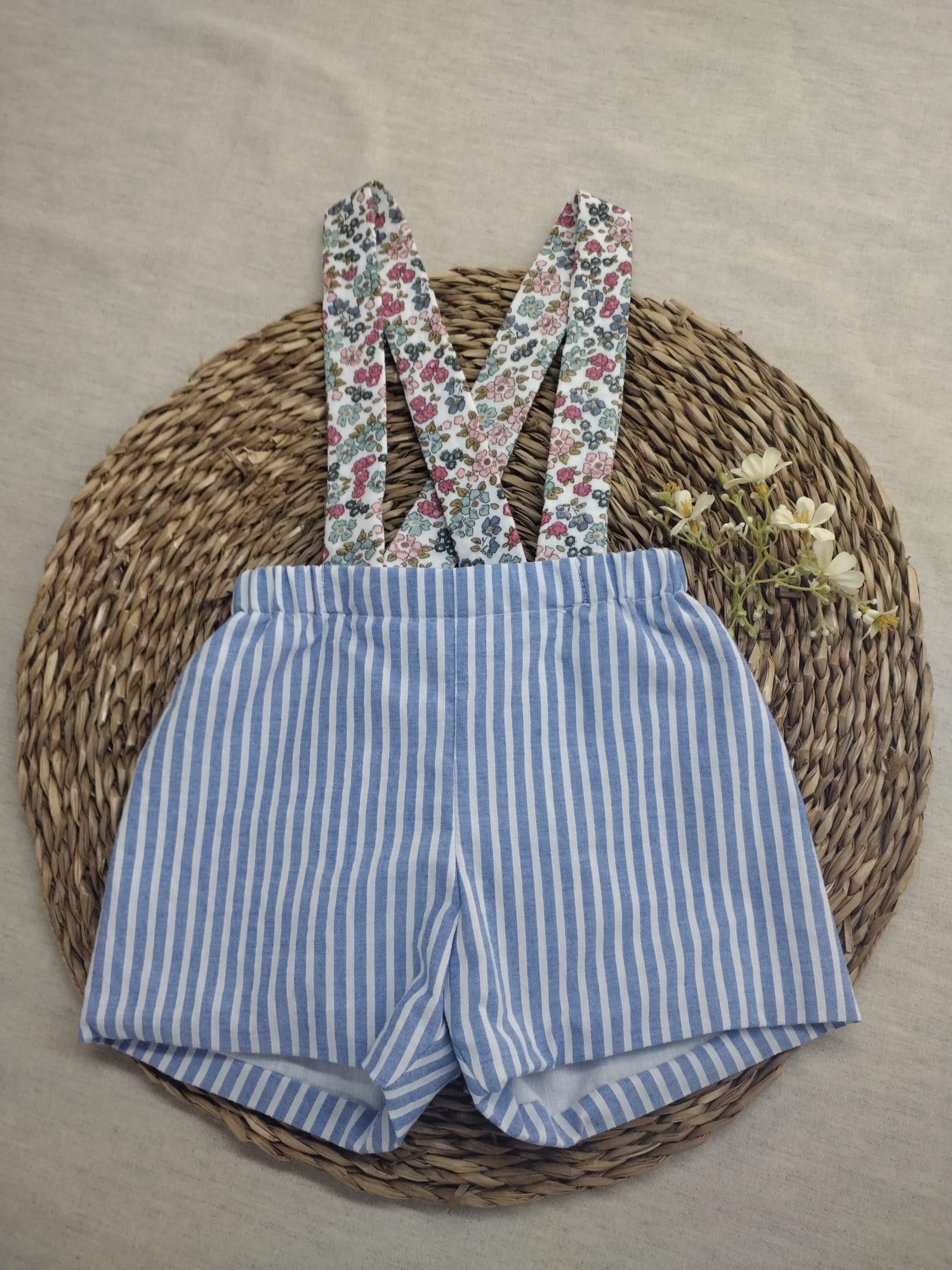 Combinado con rayas azules y blancas y con dos tirantes de quita y pon de flores.